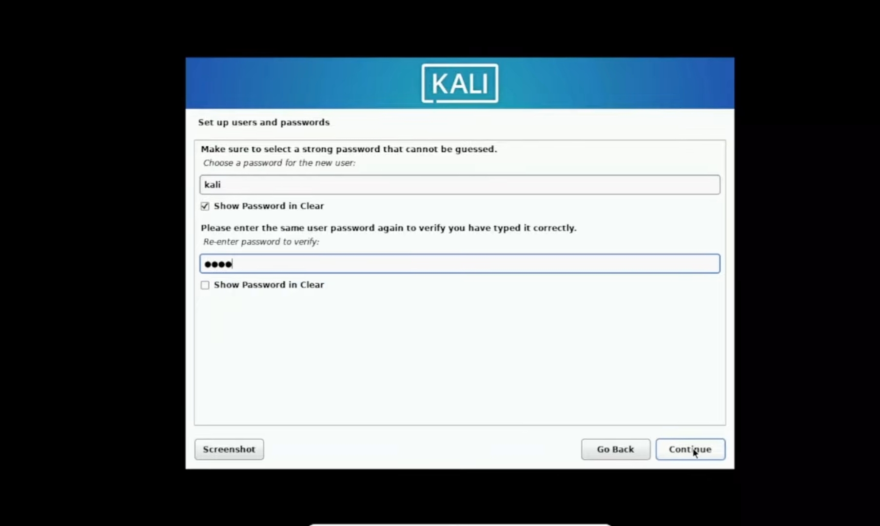 · full name for the new user: Call it "kali".