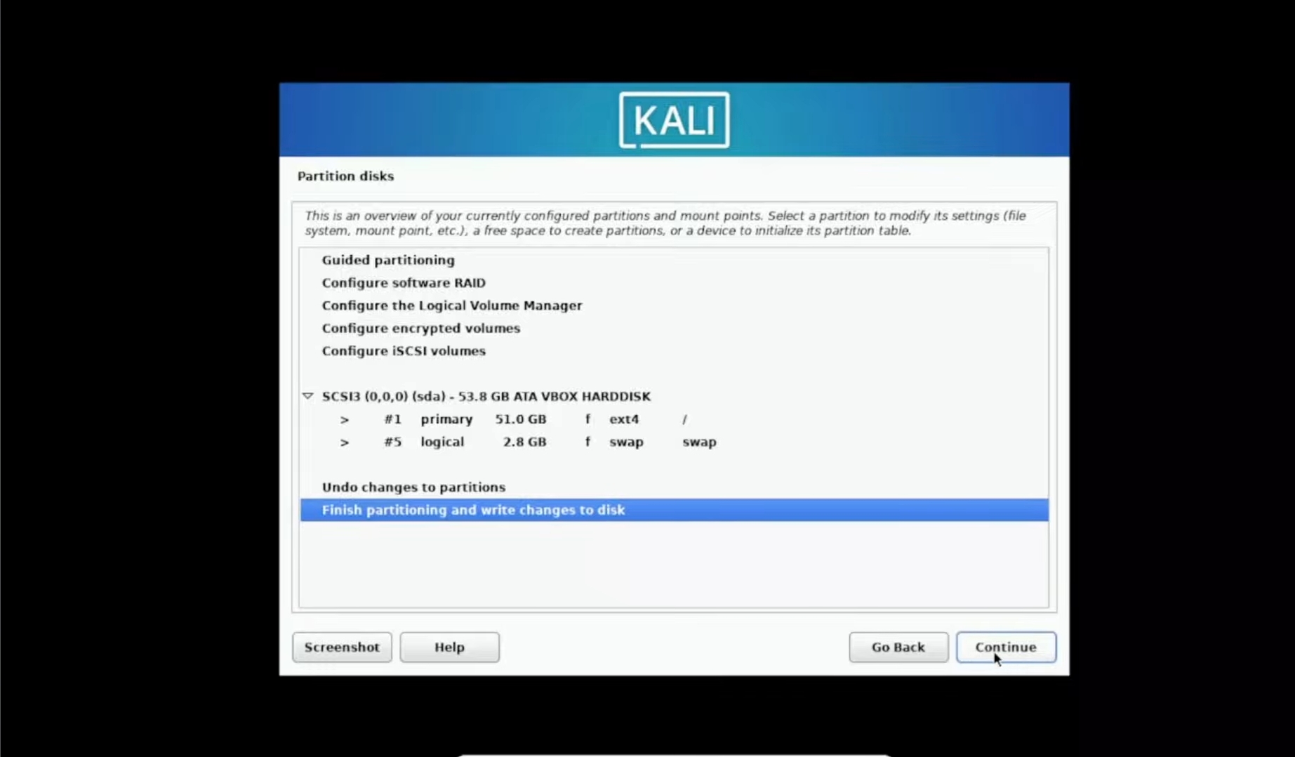 · Selected for Partitioning : All files in one Partition > continue > Select Finish Partitioning and make changes to disk > continue.