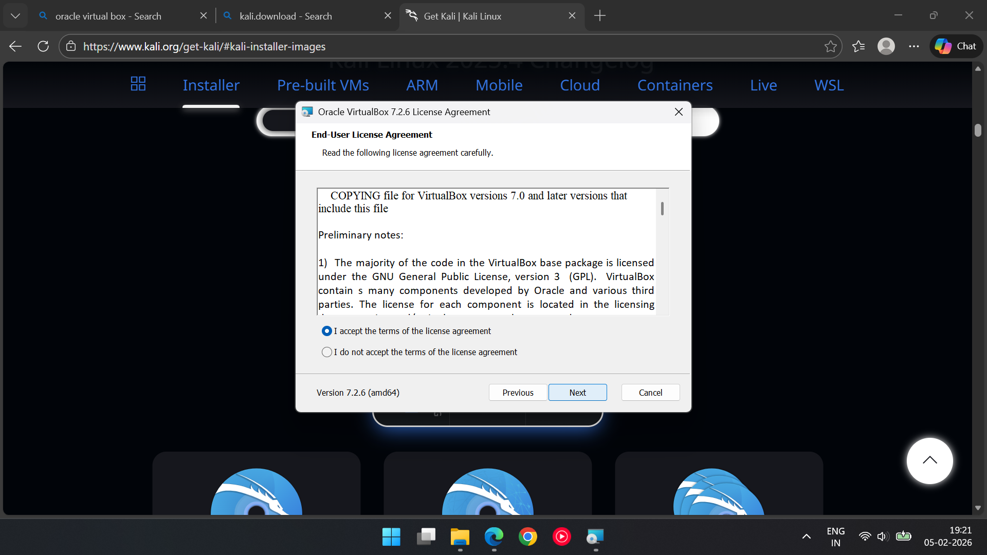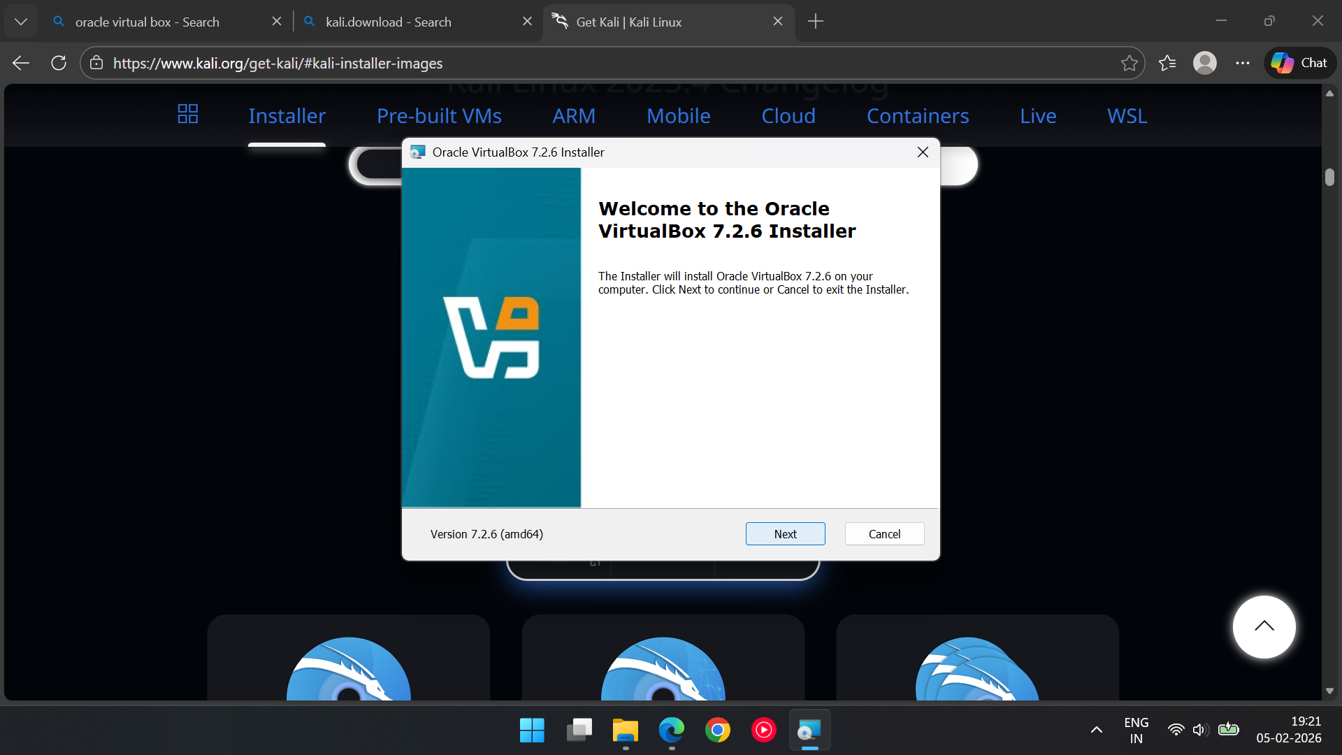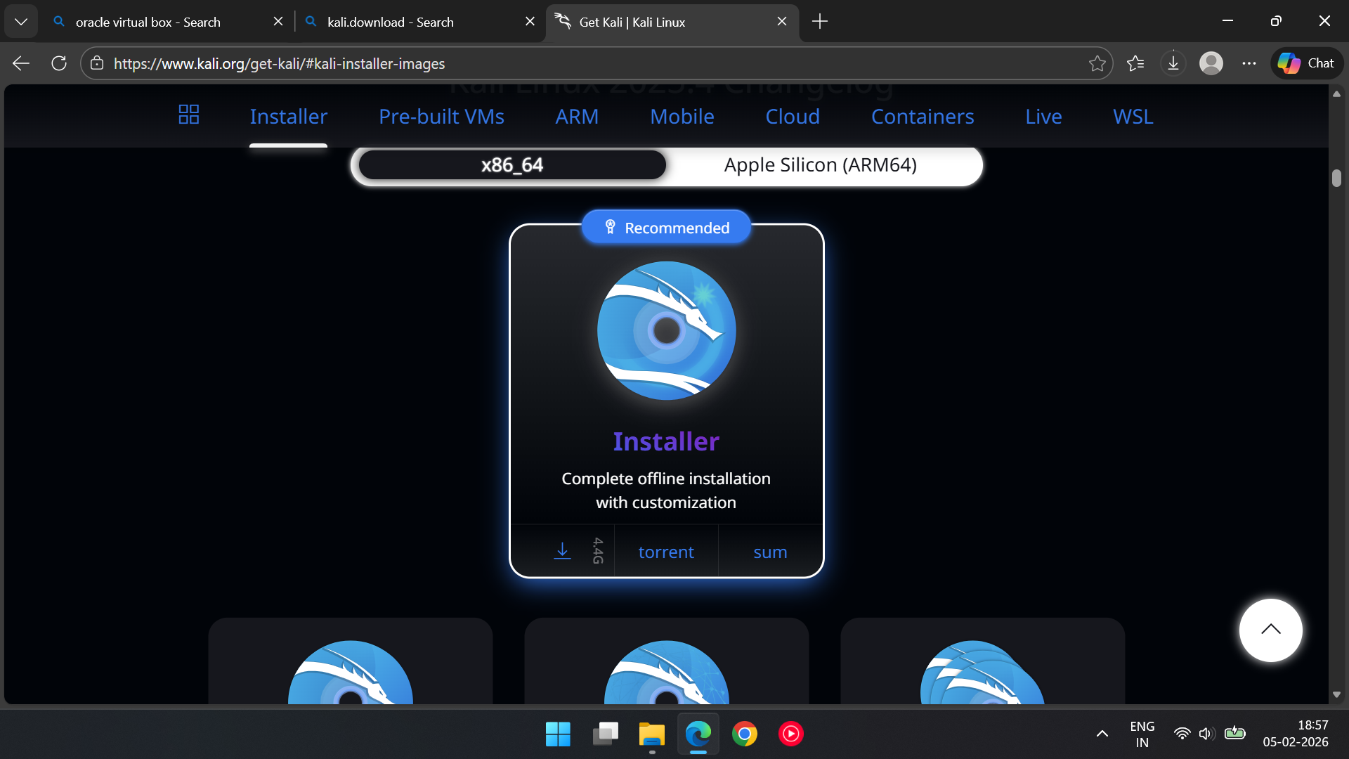 · Search for kali.download and click on first link > Installer Images > select x80_64 > Download.