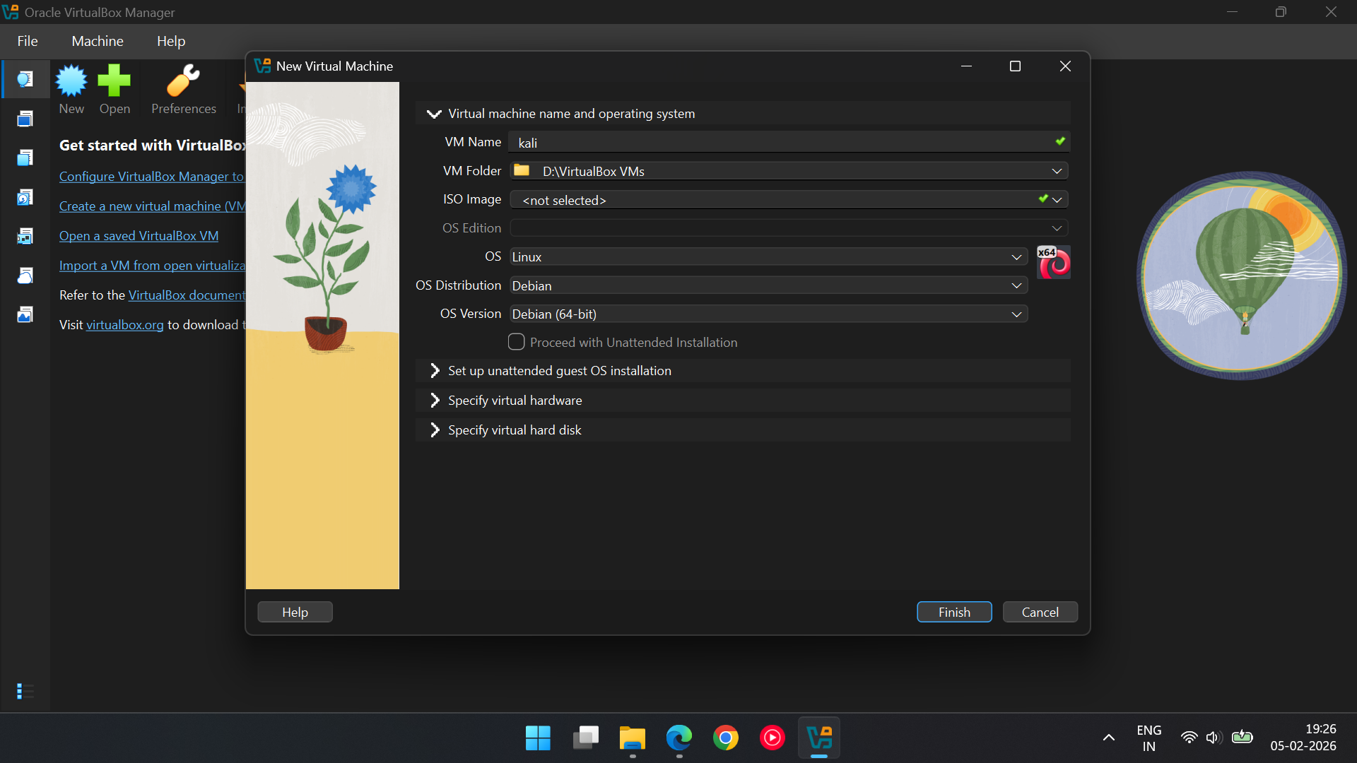 · Click on home in Virtual Box > The "New" Button > VM Name: Kali > OS Distribution: Debian > OS : Linux > OS Version: Debian (64 bit).