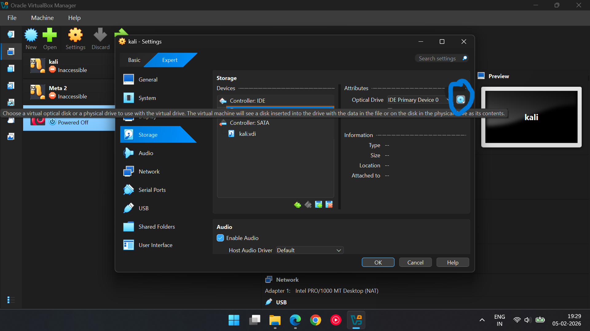> Choose a Disk File and select Downloaded Kali ISO file(usually in